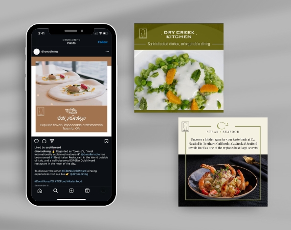 I manage the DiRōNA social media, crafting visually captivating content that highlights the finest dining establishments across North America. Using stunning, high-quality images from the featured restaurants, I focus on showcasing their culinary skills and most popular dishes. Each post is carefully designed to reflect the unique dining experience these establishments offer, ensuring that the visual content captures both the elegance and creativity of their menus. The restaurant logo and branding are seamlessly incorporated into every graphic, maintaining a consistent, professional aesthetic that aligns with the prestige of the company.